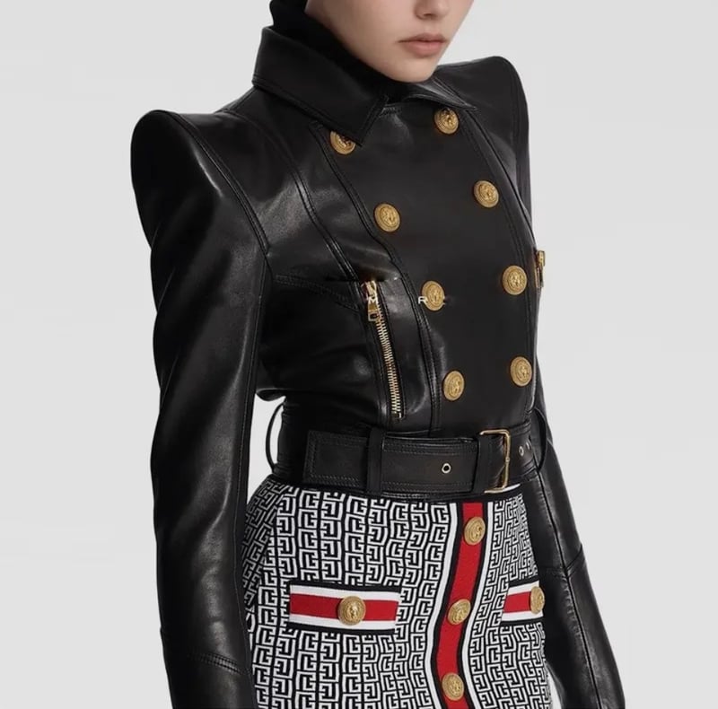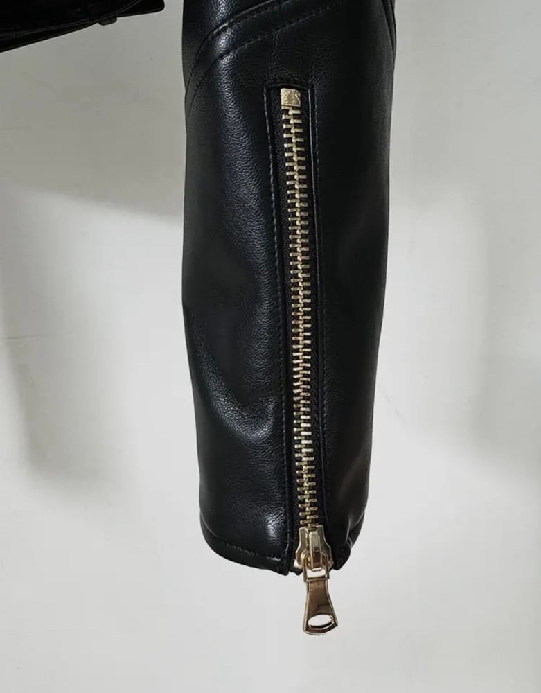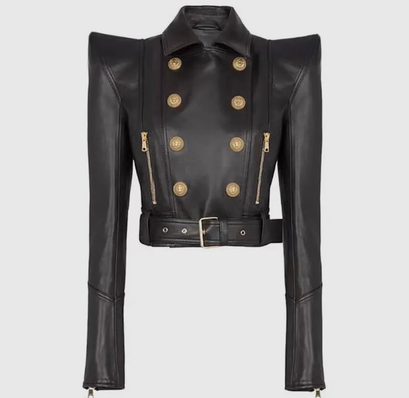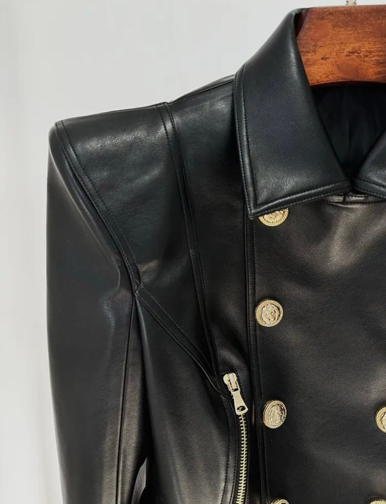 Sleek black luxury PU leather jacket with stylish stitching, gold detailed buttons, zipper pockets, double breasted and belt detail cropped jacket with gold detail. This stylish piece is not for the weak.